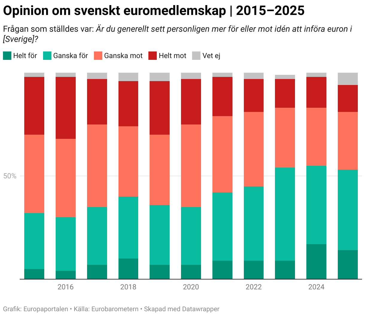 Svenskarnas inställning till euron har förändrats markant det senaste decenniet. I Eurobarometern låg andelen som var för ett svenskt eurointräde på 30 procent 2016. Därefter har stödet ökat successivt, med ett tydligt trendbrott 2023 då en majoritet för första gången var positiva till euron. Sedan dess har stödet legat kvar över 50 procent, även om det nu minskat något.