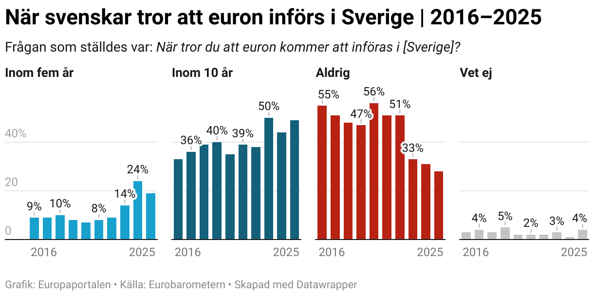 När det gäller svenskarnas uppskattning om när euron kan införas har andelen som tror på ett snabbt införande varit låg under hela perioden. 2016 trodde endast 9 procent att euron skulle införas inom fem år, och även om andelen ökade något under 2023–2024 har den nu åter sjunkit till 19 procent. Samtidigt har andelen som tror att euron aldrig införs minskat från 55 procent 2016 till 28 procent i årets mätning.