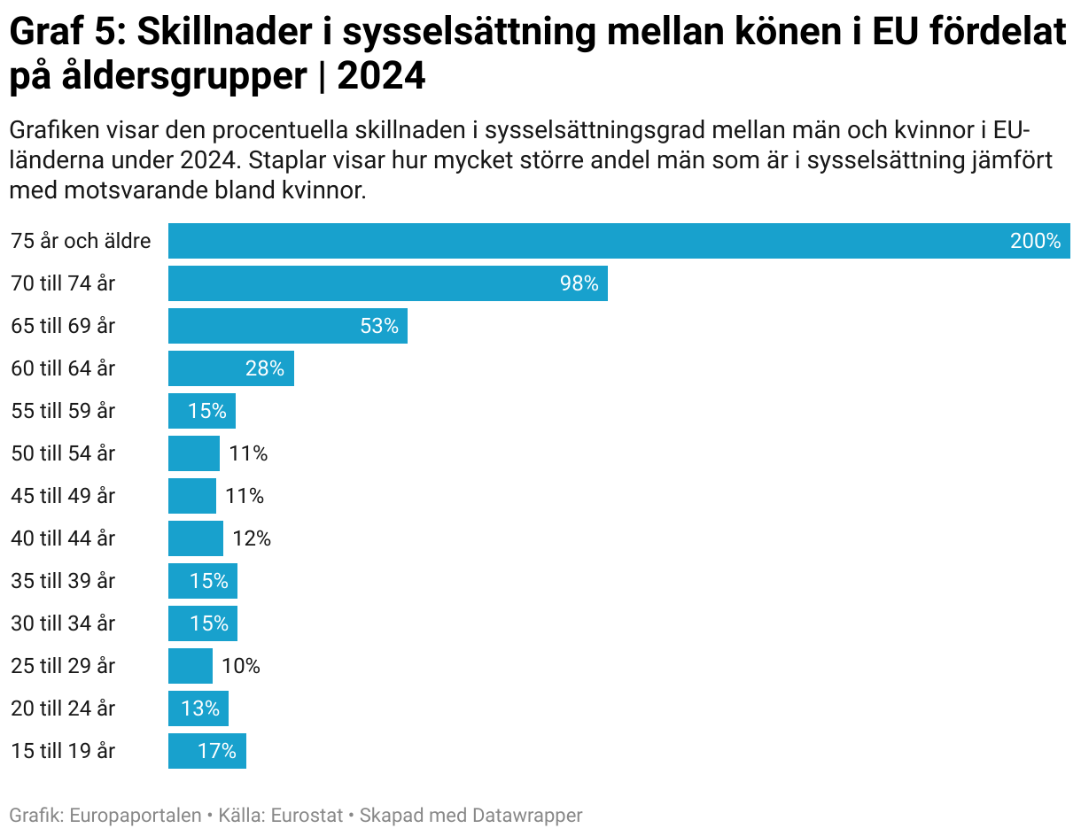 Skillnaden mellan mäns och kvinnors sysselsättningsgrad i EU är som minst före 25 års ålder, se graf 5. Fram till 34 ökar skillnaden då män jobbar mer än kvinnor, därefter minskar den. Vid 55 års ålder ökar skillnaden igen. Efter 64 års ålder arbetar betydligt fler män än kvinnor.