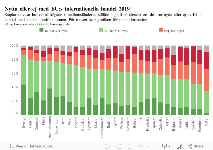 BRYSSEL 20 november 2019Det har skett en tydlig ökning i antalet EU-invånare som anser att de drar nytta av internationell handel. Svenskarna är de som i högst grad instämmer i påståendet.
